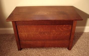 -Fumed quarter-sawn white oak toy chest with hand-carved name